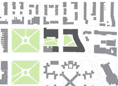Adjacent to Blackstone Square in Boston's historic South End, this project imagined a new future for the site of an existing elementary school by refining and restoring the historic street grid, and introducing two new pocket parks ringed by a mixed development of residential, retail, and office uses.